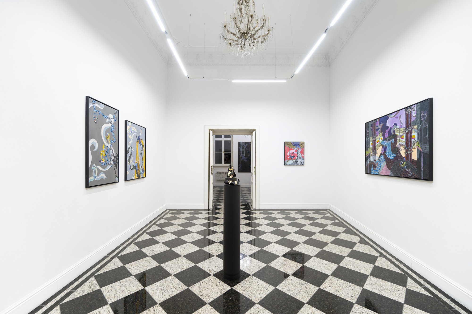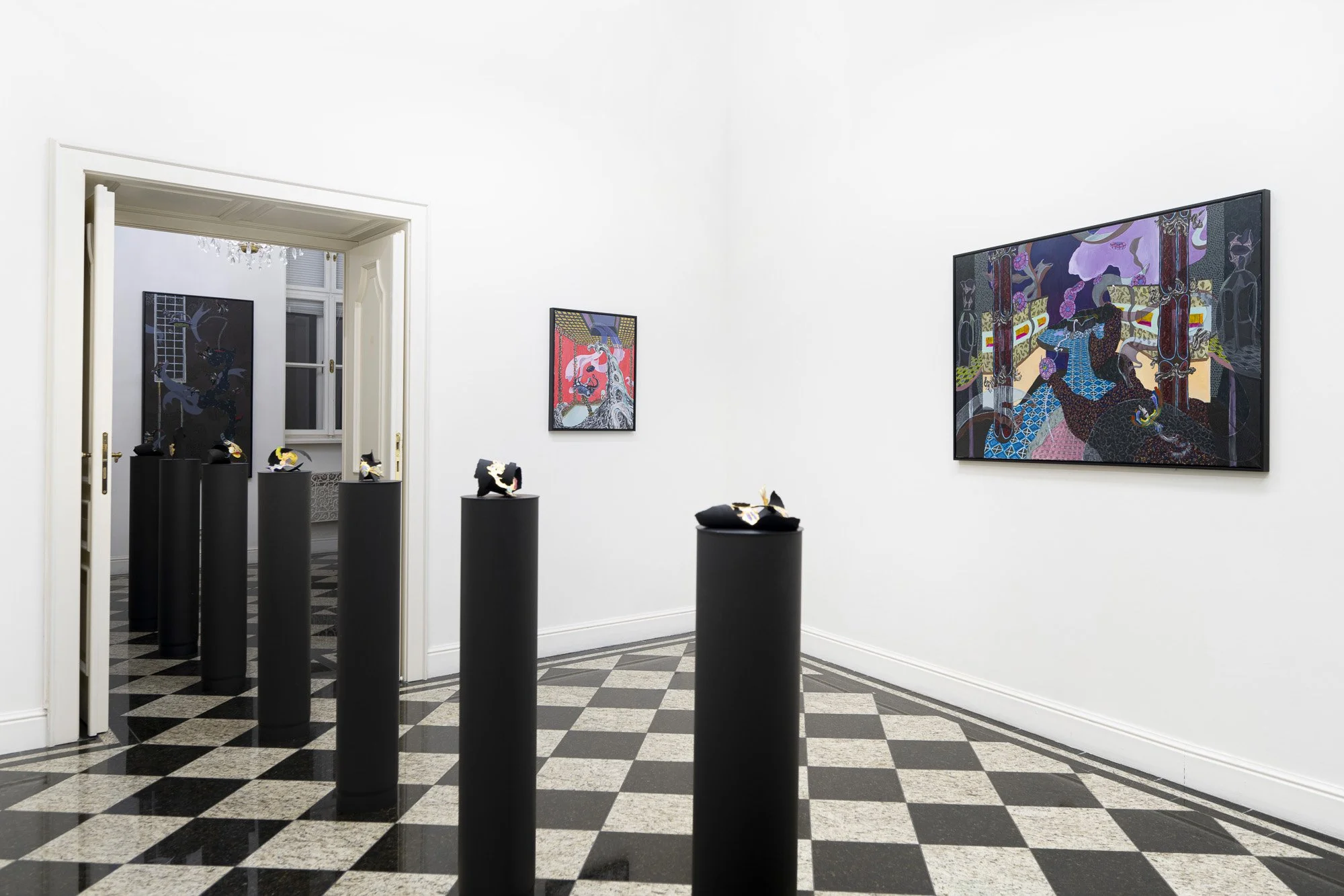 In his latest paintings, Sakul explores his well-established concept of "false spaces", which appear deceptive but on closer examination reveal strange truths within their illusory depths. These environments are often decorated with bold textures and colors that suggest a sophisticated representation of something high. Beneath this, we might say velvety sheen, however, are teeming with disturbing undercurrents and subversion. At first glance, Sakul's spaces may evoke the feeling of a home filled with fresh, rich colors that suggest luxury or opulence. However, when we analyze the surface of the objects in the paintings themselves, cracks appear in their imaginary veneer. Strange architectural distortions, uninhabited furniture and lighting that defies logic create a different reality. These interiors exist on the border between the familiar and the bizarre, where walls and objects seem ready to dissolve at any moment, and where the boundaries between tangible reality and abstraction round and curve.